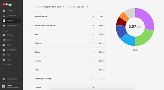 Além de multiplataforma, a ferramenta possuir um design limpo, intuitivo e com relatórios que podem ser filtrados por data, projeto, cliente, time, tag e descrição, podendo apresentar os dados em forma de textos e gráficos coloridos.